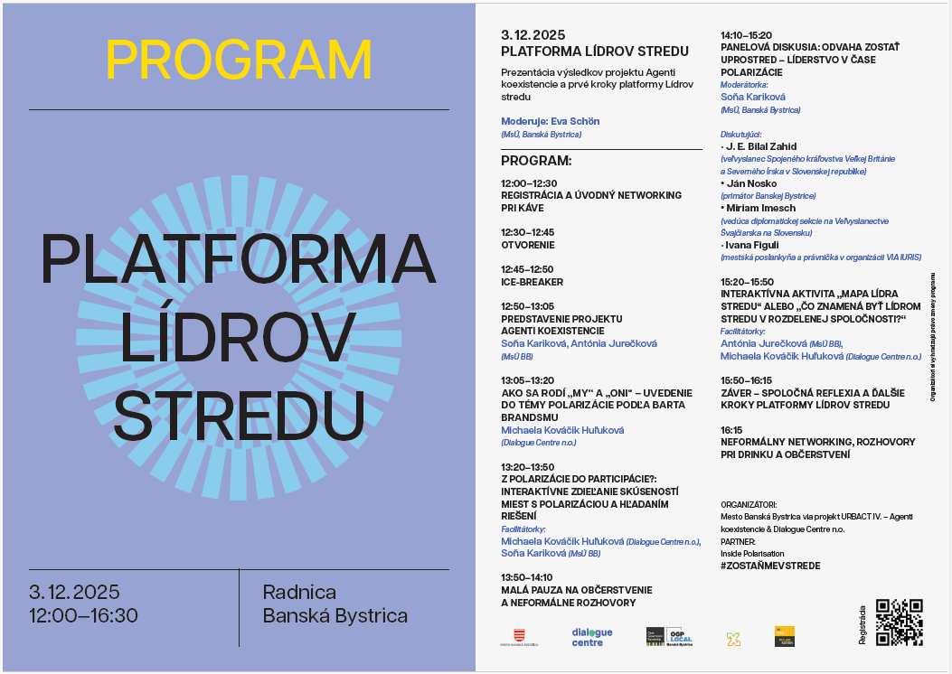 Slovensko, podobne ako mnohé iné krajiny, čelí narastajúcej polarizácii vo verejnom priestore, politike, aj v každodennom živote. Táto situácia oslabuje demokratické inštitúcie a spoločenskú súdržnosť, bez ktorých demokracia nemôže fungovať. Ako reakciu na tento trend mesto Banská Bystrica spolu s Dialogue Centre n.o. a s podporou projektu URBACT IV – Agenti koexistencie, realizovali v uplynulom období sériu workshopov Ako strategicky pracovať s polarizáciou. Dňa 3. decembra 2025 sa v historickej Radnici na Námestí SNP v Banskej Bystrici uskutoční podujatie, na ktorom samospráva predstaví výsledky realizovaného projektu a otvorí tému líderstva stredu – odvahy zostať uprostred v čase polarizácie.