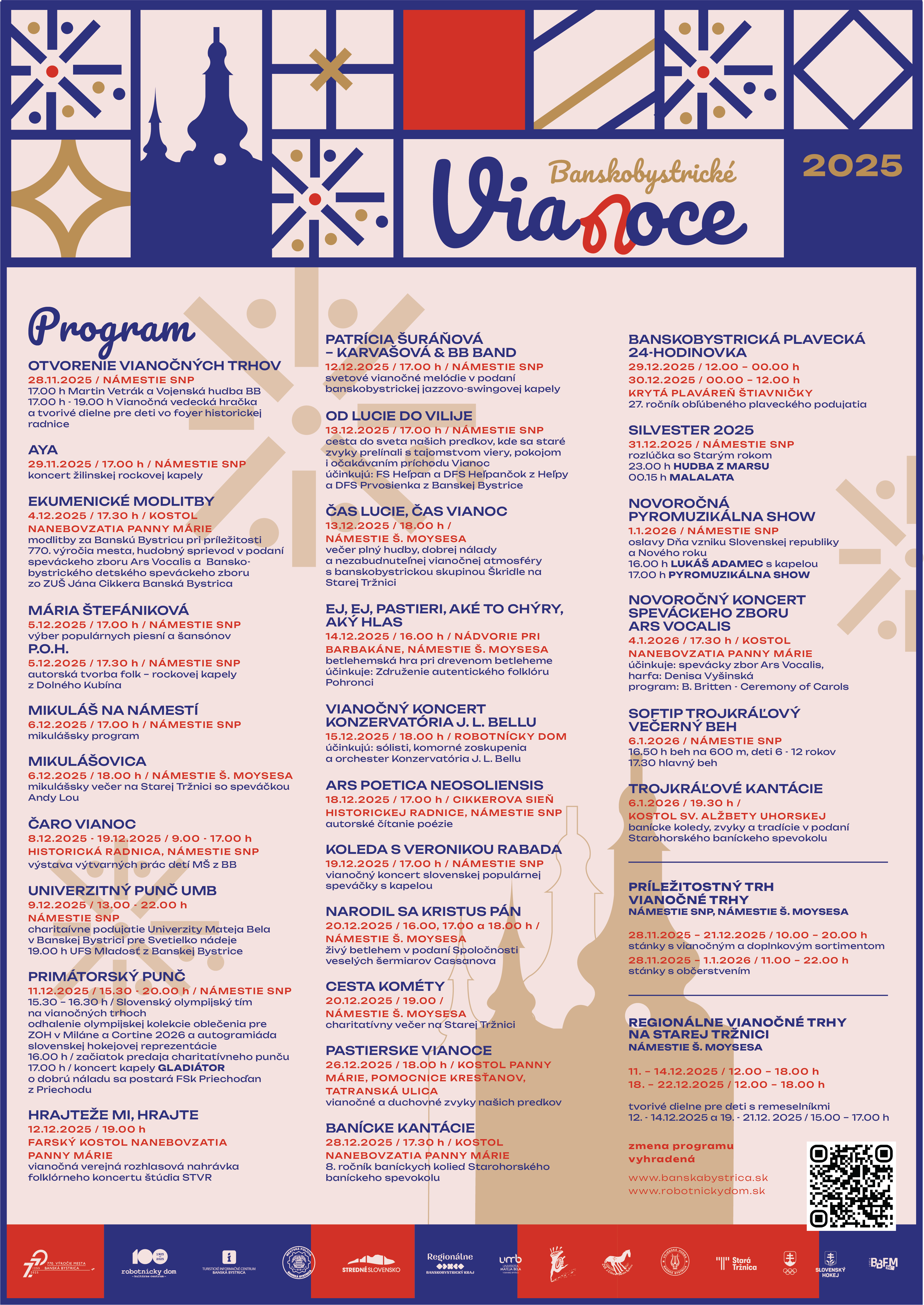 Advent a Vianoce patria k najkrajším obdobiam v roku a už tradične sa aj v meste pod Urpínom spájajú s nezameniteľnou sviatočnou atmosférou. Vianočné trhy plné vôní a chutí, centrum zaplavené tisícami svetielok, ale aj bohatý kultúrny program plný zvykov, tradícií a dobročinnosti. To všetko bude aj tento rok súčasťou Banskobystrických Vianoc 2025. Pozývame Banskobystričanov, Banskobystričanky a návštevníkov mesta, aby sa od piatka 28. novembra naladili na pravú vianočnú atmosféru a vychutnali si čaro Vianoc. Výťažok zo systému vratných pohárov, ako aj z Primátorského punču, tento rok poputuje Únii nevidiacich a slabozrakých Slovenska, Krajskému stredisku v Banskej Bystrici.