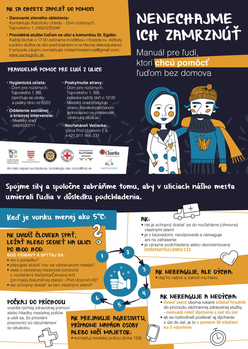 Pre účely informovania širokej verejnosti vznikol pred pár rokmi leták s názvom Nenechajme ich zamrznúť, na ktorého tvorbe sa podieľali mesto Banská Bystrica a Slovenský Červený kríž. Leták obsahuje všetky informácie, formy a miesta pomoci v jednom a je dostupný na webe mesta.