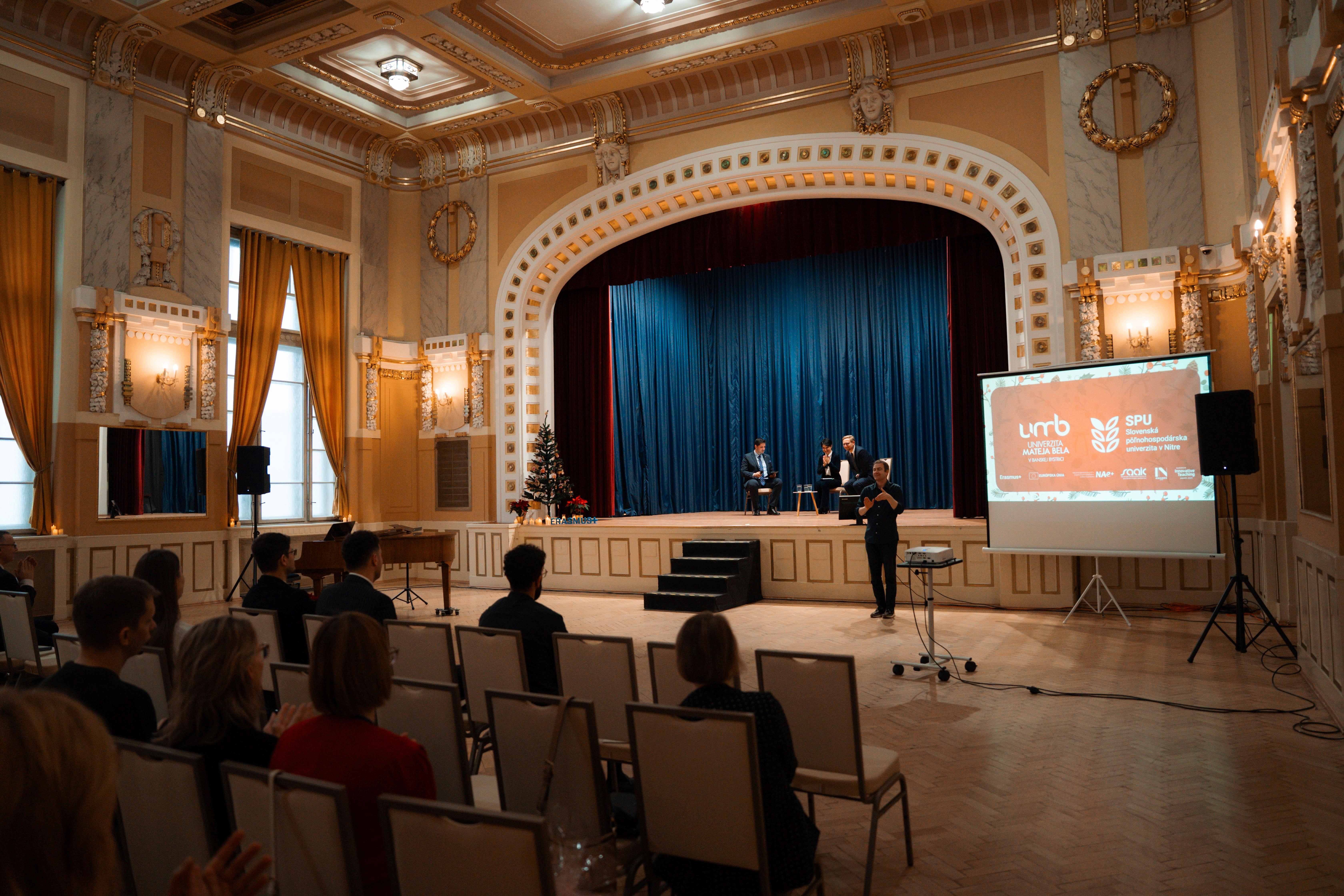 Ocenenie prevzal prof. Mgr. Jaroslav Ušiak, PhD., prodekan pre vedu, výskum a rozvoj a poverený výkonom funkcie prodekana pre medzinárodné vzťahy a vzťahy s verejnosťou FPVMV a člen Dozornej rady SAAIC, počas slávnostného odovzdávania 11. 12. 2025 v Moyzesovej sieni FiF UK v Bratislave, za účasti tímu Referátu medzinárodnej spolupráce UMB.
