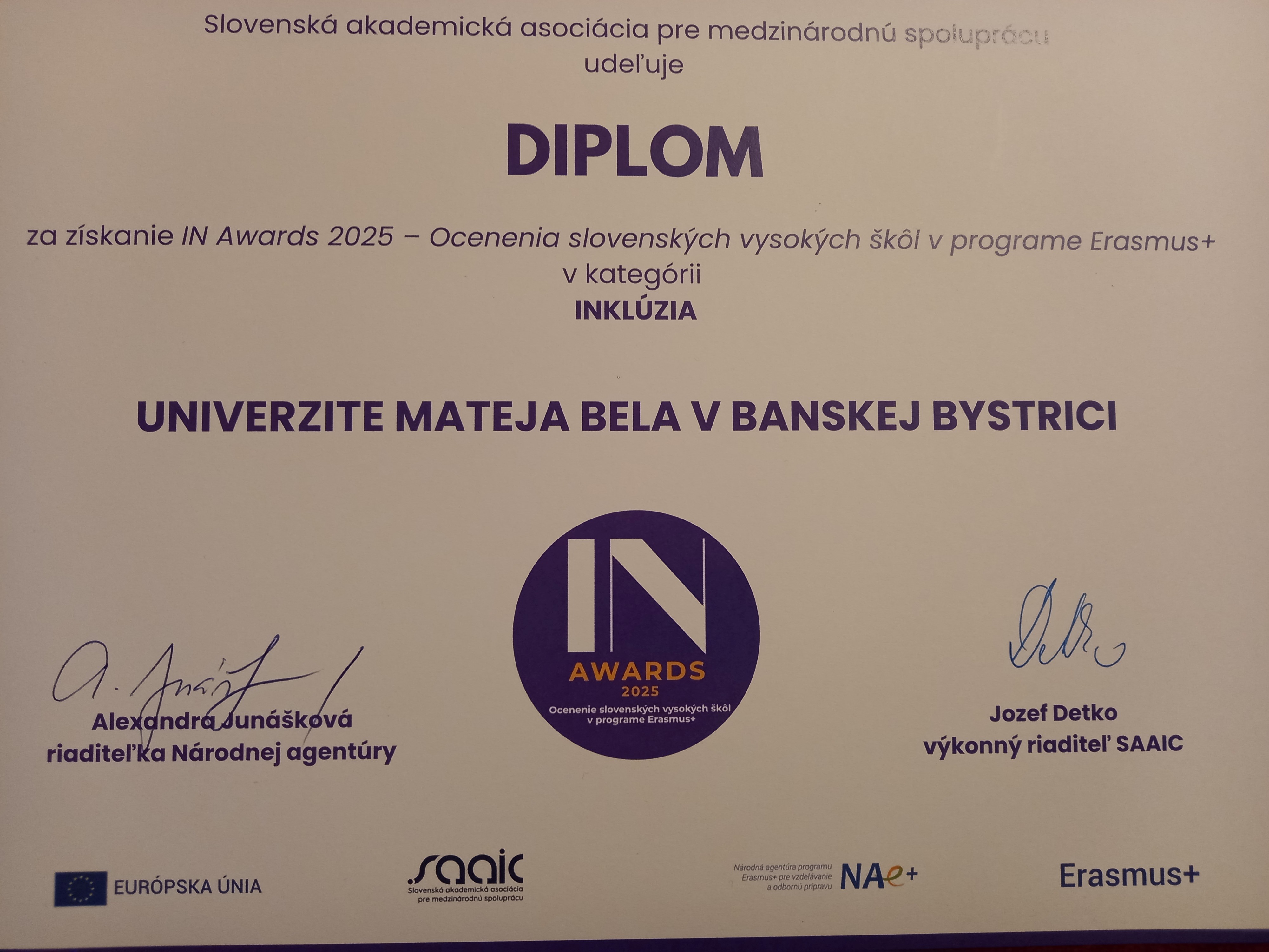 Univerzita Mateja Bela v Banskej Bystrici sa stala víťazom kategórie Inklúzia v rámci ocenení IN Awards 2025, ktoré vyzdvihujú inovatívne prístupy podporujúce otvorenosť, spoluprácu a rovnosť príležitostí vo vysokoškolskom prostredí.